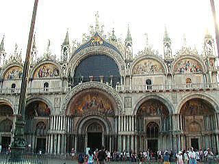 下層アーチの上にあるブロンズ製の四頭の馬は十字軍がコンスタンチノープルから略奪してきたもののレプリカである。本物は堂内の博物館にある。上層アーチにはゴシック式の尖塔が配されていて、中央アーチ上には聖マルコと翼を持った獅子の像があった。聖マルコの遺骸といい、馬のブロンズ像といい、やたらに略奪品の多い教会である。地中海の覇者の位置をジェノバと競い合っていた頃の名残だろう。教会もまた国家の威信を示すために建てられていたのだ。