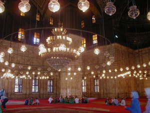 中に入ると、また驚かされる。偶像崇拝を禁じたイスラム教ではモスクを飾るのに絵や彫刻を用いることはできない。そのため、幾何学文様を複雑に組み合わせた所謂アラベスクが発達した。今まで見たモスクの中はアラベスクでびっしり埋めつくされていた。ところが、不思議なことにこのモスクにはアラベスクが見あたらないのだ。その代わり雪花石膏独特の肌理が周りの壁を飾っていた。半球状の天蓋部分を見上げると、まるでキリスト教の教会のようなロココ風の飾りで覆われている。ムスタファの話では、雇われた建築家がイタリア人だったそうだ。なるほど、それで分かった。アラベスクで飾ろうにもそのノウハウを持っていなかったのだ。結果的には、ステンドグラスやロココ調ドームに飾られたある意味では華麗なモスクが誕生したわけで、異教徒である我々には格好の目の保養だが、ムスタファに言わせると華美に走りすぎていてエジプト人には評判が悪いという話だ。