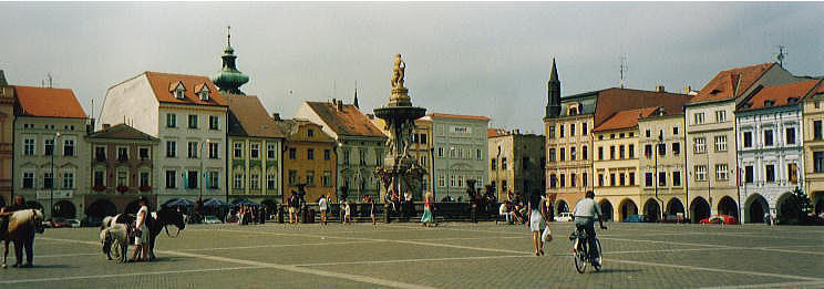 昼食はチェスケー・ブジェヨブィツェという街で食ぺることになっていた。相変わらず道不案内な運転手は車を止める場所がわからず旧市街の周りをぐるぐると回り続けるばかりだった。しかたなく私たちは車を降り、歩いて旧市街の中に入っていった。石畳の道をはさんだ両側には明るい黄や水色の塗料を塗った壁を持つ古い家並みが続いていた。