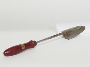 火鉢などの炭火の中に先のとがった金属の部分を入れて、直接熱して使いました。衣服や布のしわを伸ばしたり、折り目をつけるときに使いました。冷めてしまったらまた炭火の中に入れて使いました。