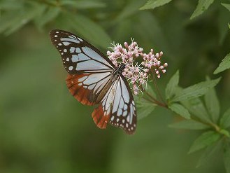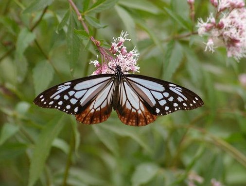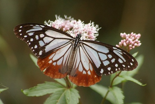 アサギマダラは、その名が示すように浅葱色(あさぎいろ)のまだら模様の美しい羽を持ち、羽を広げると10センチほどのマダラチョウ科の大型の蝶で、冬場は台湾、南西諸島等の暖かい場所で過ごし、春に日本列島を北上し、夏に本州の高山地帯や東北地方などで繁殖します。その子孫が秋になると暖かい地方に南下して行きます。