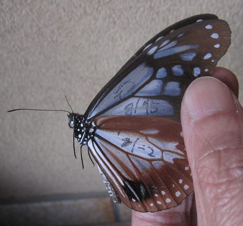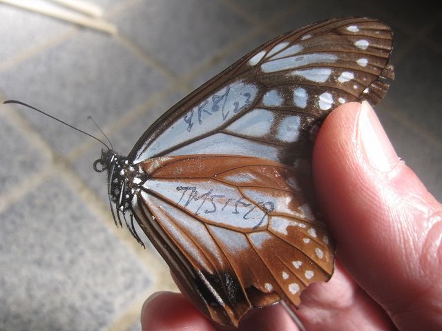 再確認(再捕獲)情報 鳥羽市船津町でマーキングして放蝶したアサギマダラの再確認情報です