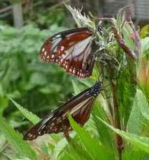 フジバカマの若芽の先から出る液を吸う♂2頭。この日は4頭の飛来を確認する。