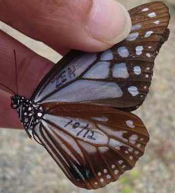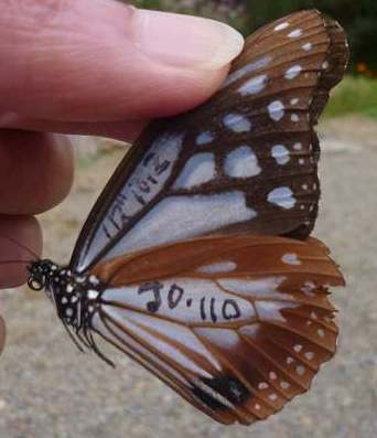 6 | 10.14 ハズ BR 709 | ♂ | 10月17日 11:50 | 愛知県西尾市東幡豆町三ケ根山 | 3日間 | 約48Km | トバF 10/17 U-235を追記放蝶 |