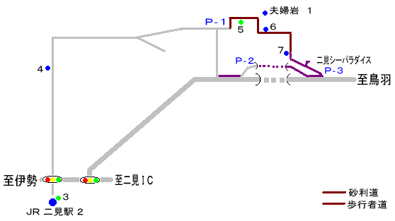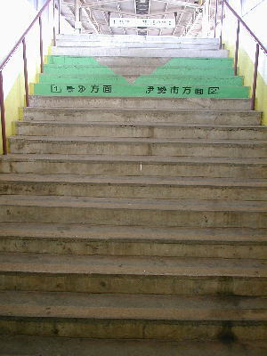| ・2 JR二見駅 毎日7:30〜16:50 臨時駅員在勤 夫婦岩から約1.5Km 急行快速「みえ」停車 乗車時、ホームと列車の段差25cm。事前に伊勢市駅にお願いすれば、乗車時・階段の昇り降りを手伝ってもらえる。 0596-28-3597 二見駅階段 踏み面 30cm 蹴上 15cm |
