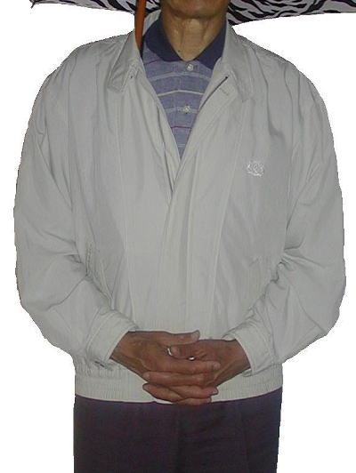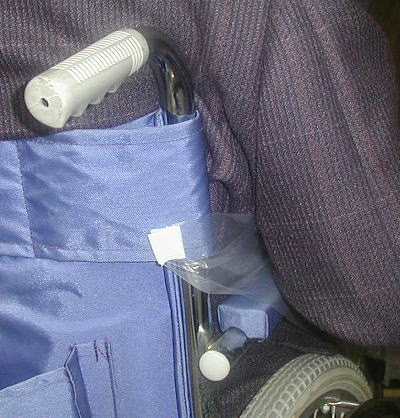 5 傘をさした状態にして、傘の取って部を留め具2に取り付ける。