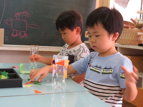 カードとヒヤシンスの球根と水栽培容器を贈りました。 園児が容器にかざりつけをしました。